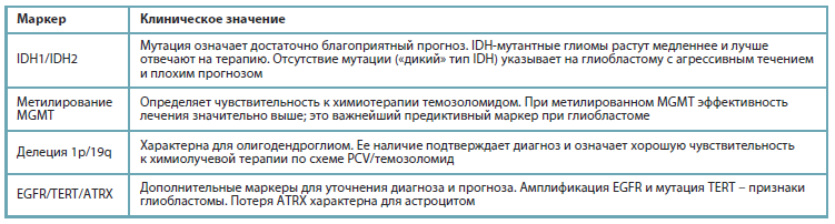 Основные тесты при глиомах взрослых сегодня – это определение мутаций генов IDH1/IDH2, делеции хромосомных плеч 1p/19q, метилирования промотора гена MGMT, а также статуса TERT, ATRX и амплификации EGFR. Разберем каждый маркер подробнее в таблице.